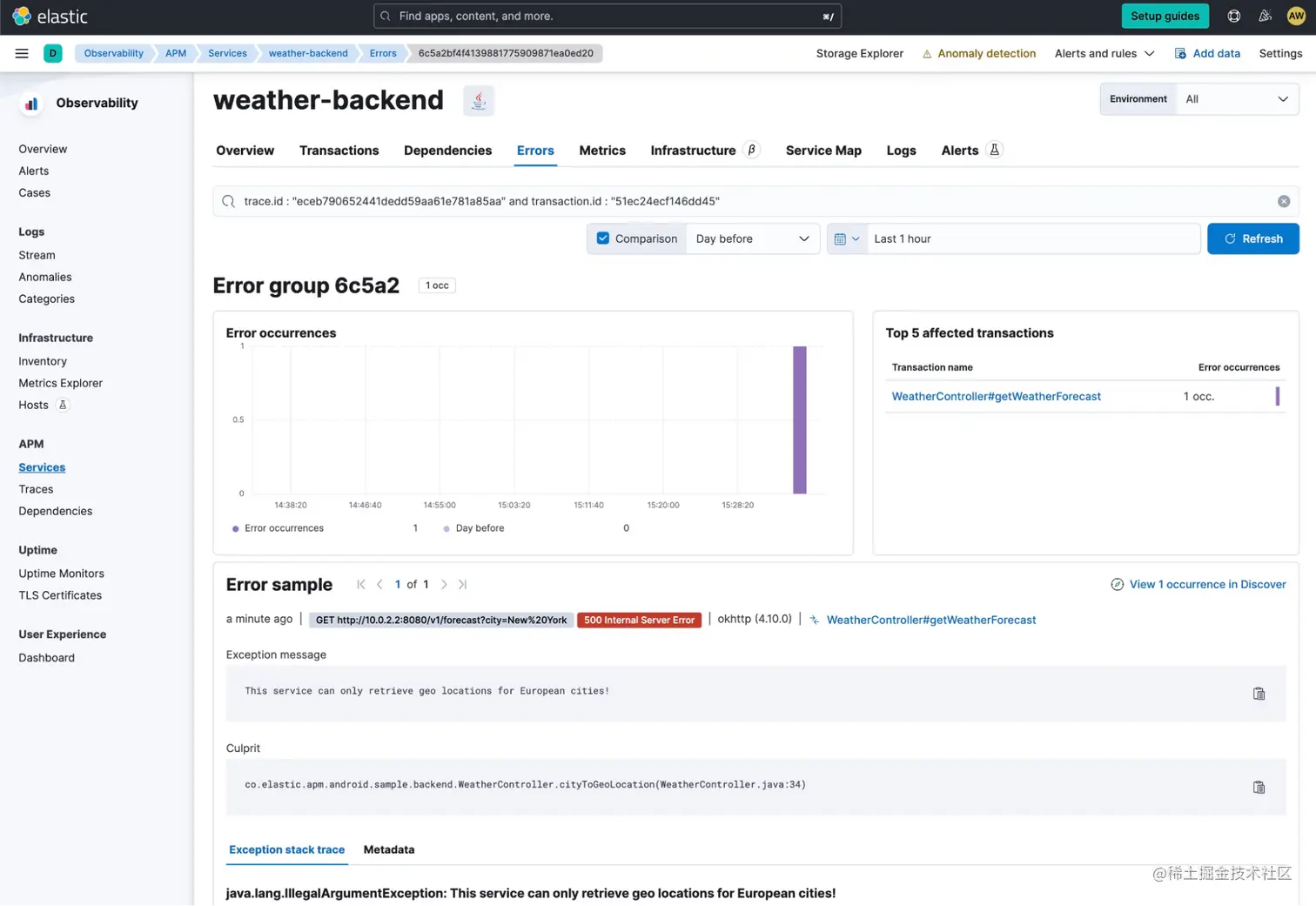 天气后端的异常消息指出 “This service can only retrieve geo locations for European cities!” 这就是选择 New York 作为城市的问题。