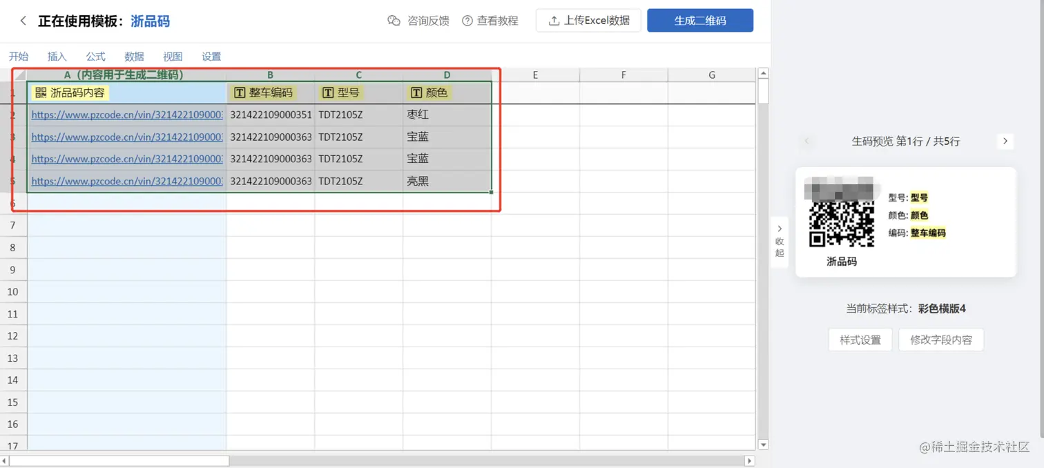 3. 点击【+批量生码】,将Excel数据填入在线表格