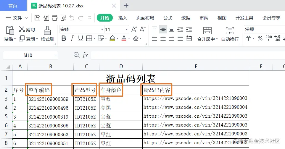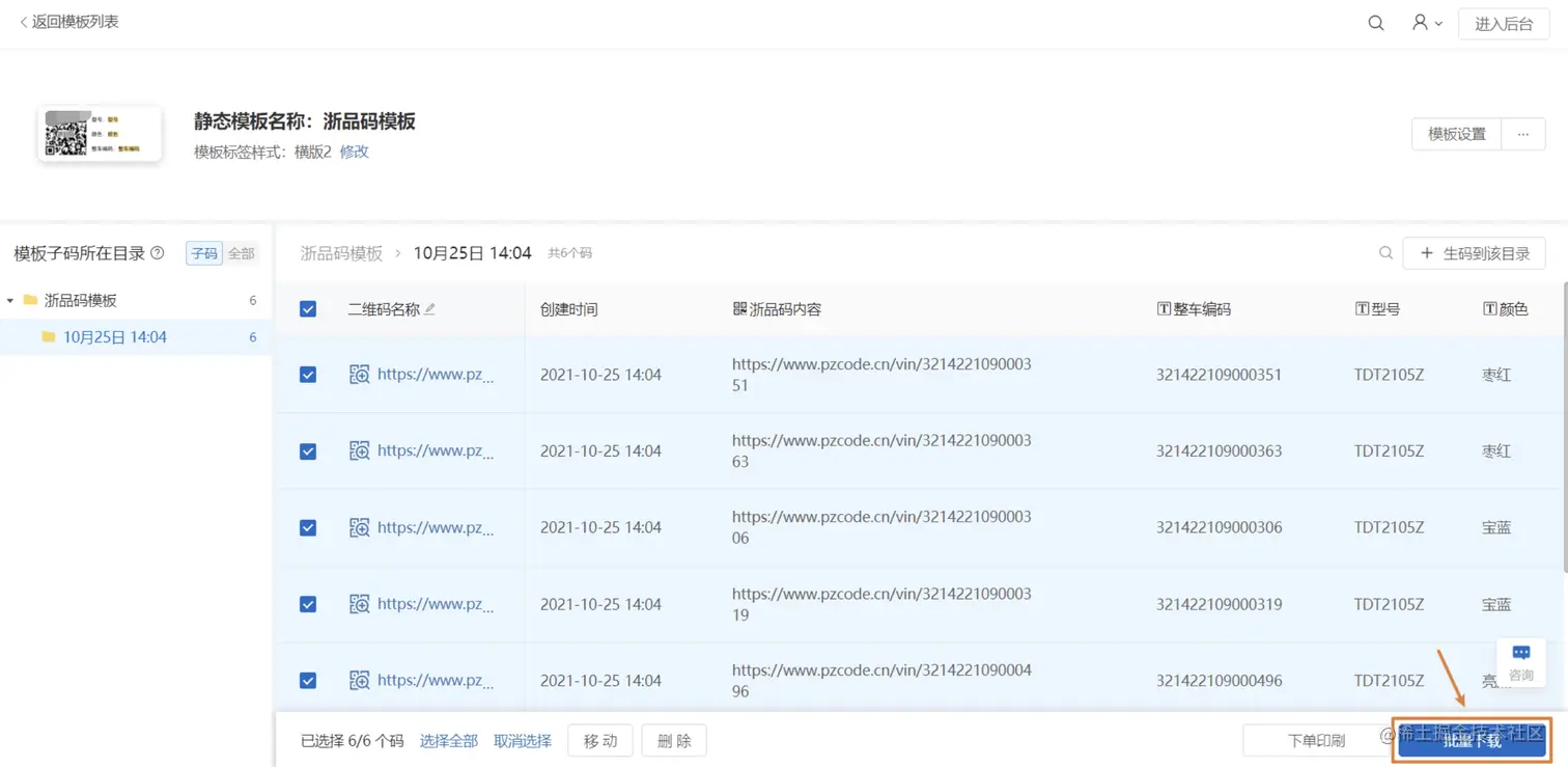 【浙品码列表】包含浙品码内容、产品型号、颜色、整车编码四个字段数据。浙品码内容将会生成二维码,扫码跳转对应的网址。产品型号,颜色,整车编码将显示在标签上,便于张贴的时候区分。