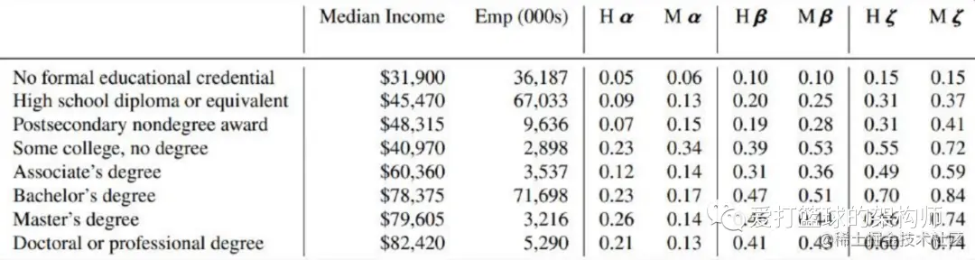 结论四:高学历更容易受到 GPT 的冲击:持有学士、硕士和更高学位的人比没有正规教育学历的人更容易受到 GPT 的冲击;