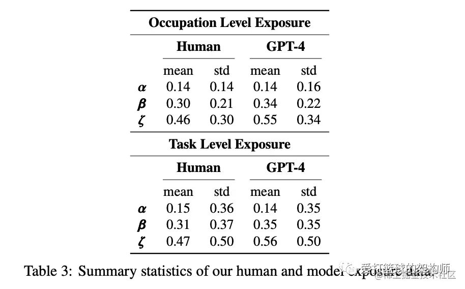 前文将暴露度 Exposure 这一指标的定义进行了描述,论文中还将暴露度的衡量指标α、β 和 ζ 进行了统计数据的汇总。不论采取人类打分的方式还是 GPT-4 打分,暴露度α的均值在0.14左右,表示了从平均意义上说,15%左右的职业/任务暴露于GPT,即 15%左右的工作可能会被现有的 LLM/GPT-4 降低 50%以上的工作时间。类似地,暴露度 β 和 ζ 均值分别在 0.3 和 0.5 左右,代表 30%/50%的职业或任务将受到中/高水平的 GPT 冲击,即减少工作时间 50%及以上。