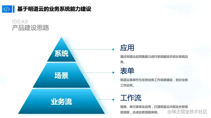 其实我们是有一定产品建设思路的。明道云本身是以应用表单和工作流为载体的开发工具,但是对于我们一个相对传统的互联网公司来说,我们希望通过让系统结构、系统边界足够清晰的方式,来保证后续数据使用过程的稳定高效,避免重复迭代,重复地做重置动作。所以,我们用系统去对应应用场景、表单,业务流对应工作流。