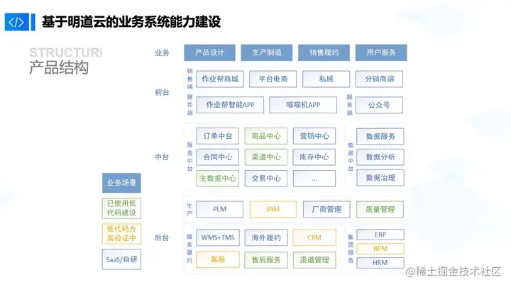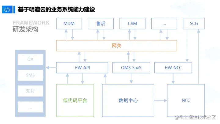 明道云在我们的研发体系中,更偏向于底层的一些服务能力。它会通过网关的形式,和前中后台的系统做衔接。这种设计结构保证了我们的业务动作都能进行高速迭代。