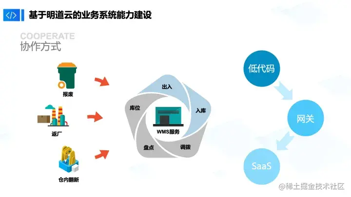 第三种方式是低代码+网关+SaaS。对于我们来说,其实WMS服务相对复杂,除了商品本身的管理以及出入库以外,还涉及到调拨、盘点、库位以及正常销售场景下的链路打通。在这个场景下,我们将WMS的SaaS服务与低代码衔接,完成了这套链路的执行。