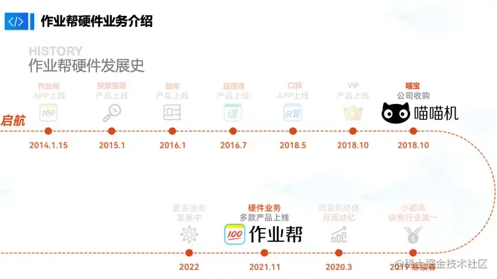 作业帮成立于2014年,在整个业务周期至今,其实已经做了很多业务线。其中两个点是涉及到硬件部分:第一个是2018年,作业帮收购了喵喵机。喵喵机是一个以热敏打印机产品为切入点,切入到错题打印,也就是学生这个场景下的硬件产品。第二个是2021年,作业帮自己做了一套硬件产品生态。在2021年双减政策出台之后,作业帮更多地倾斜到硬件产品上。目前,作业帮以作业帮硬件和喵喵机作为硬件的双品牌战略。