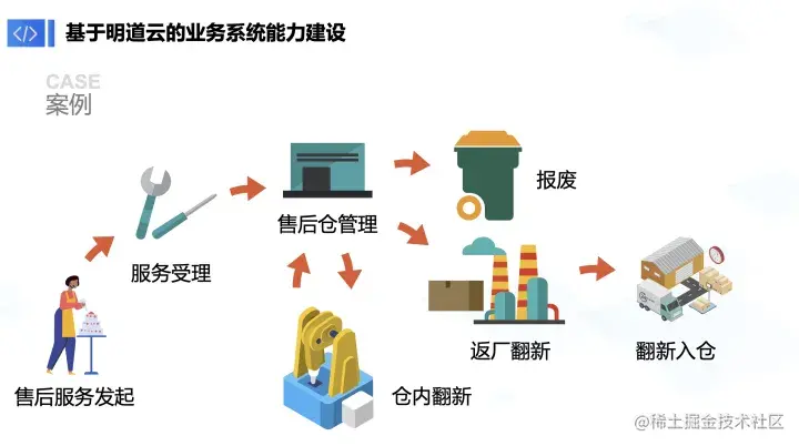 在这套链路里面其实已经拆解出来了:用户售后服务发起之后,我们的客服人员以及售后人员进行服务受理,坏品会在售后仓进行管理,有可能会报废掉,有可能会进行这个工厂的翻新,也有可能会进行仓内的翻新。