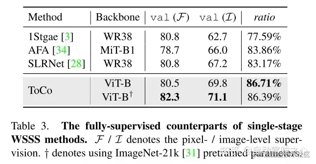 前言 ViT可以缓解弱监督语义分割 (WSSS) 中,CAM生成伪标签无法识别完整对象区域的问题,但是它也造成过度平滑的问题。为了解决这个问题,本文提出ToCo方法,首先,由于观察到 ViT 中的中间层仍然可以保留语义多样性,设计了一个 Patch Token Contrast 模块 (PTC)。 PTC 使用从中间层派生的伪标记关系来监督最终的补丁标记,允许它们对齐语义区域,从而产生更准确的 CAM。其次,为了进一步区分 CAM 中的低置信度区域,设计了一个类标记对比模块 (CTC),CTC 通过对比它们的类标记来促进不确定局部区域和全局对象之间的表示一致性。