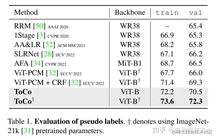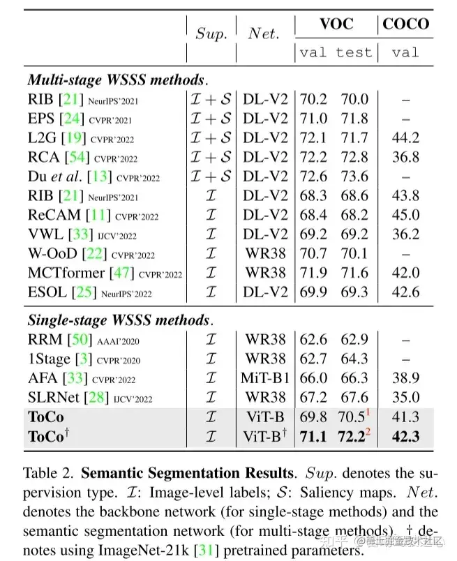 在PASCAL VOC[14]和MS COCO数据集[26]上的实验表明,提出的ToCo方法可以显著优于SOTA single-stage WSSS方法,并且可以达到与multi-stage竞争对手相当的性能。