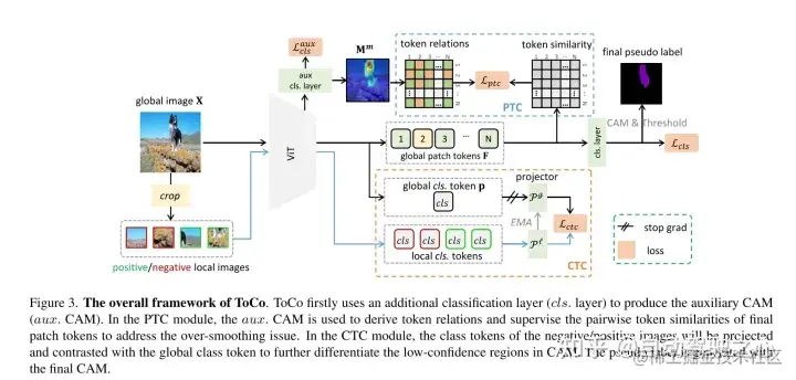 如图3所示,ToCo在ViT编码器中使用一个辅助分类层来生成辅助CAM。随后利用辅助CAM生成辅助伪标签并引导PTC模块。同时,它也被用来为CTC模块生成裁剪正面和负面局部图像的提议。利用分类层获得最终CAM,并且使用该最终CAM来生成最终伪标签。