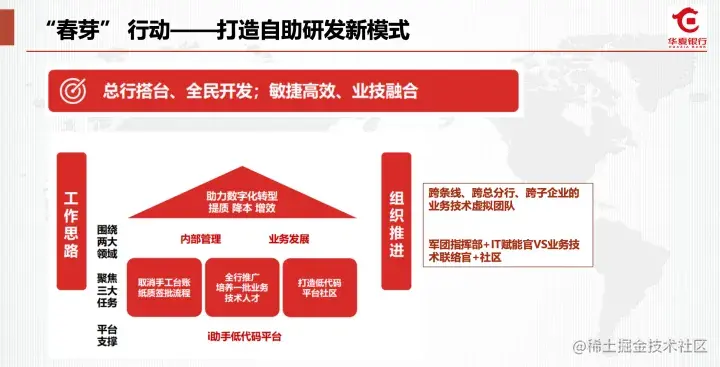 行动的总体思路是总行搭台,全民开发,敏捷高效,业技融合。具体的工作思路是以我们的 i 助手低代码平台做支撑,聚焦三大任务,围绕两大领域。
