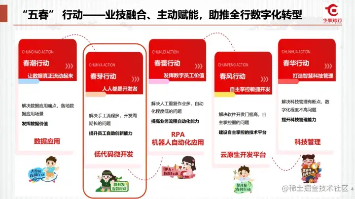 当前,数字化转型是我行的重要战略转型方向。去年初起,我行信息科技部主动发起了面向全行的“五春”行动,包括春潮、春芽、春蕾、春风以及春华,覆盖了数据、低代码,RPA 等五大领域。其中,春芽行动就是低代码推广行动。