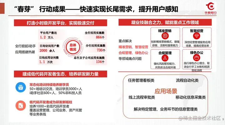 基于平台,我们聚焦了三大任务。首先是取消手工台账纸质签批流程,我们计划在今年年底原则上取消全部存量的手工台账还有签批流程;第二就是在全行推广培养一批业务技术人才,也就是我行的数字化人才;第三是打造低代码平台社区,营造全员学习应用低代码的良好氛围。