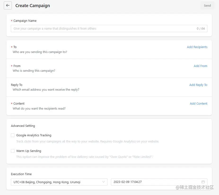 4. 完成以上,您就可以通过Campaign创建邮件发送任务了。依次选择收件人、发件人、您的回复地址、邮件模板、谷歌追踪开关、预热式发送开关、设置发送时间即可。当然,你也可以设置定时发送。