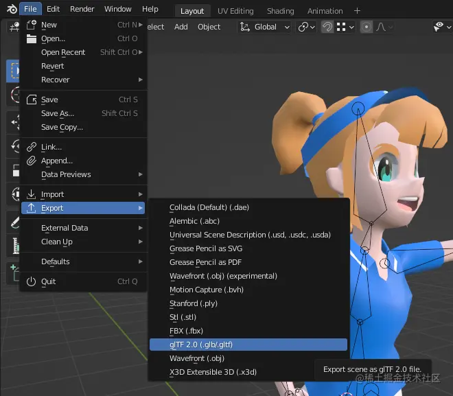 如果你的动画已准备好添加到你的游戏/项目中,请导航至文件 > 导出 > glTF 2.0(.glb、.gltf)导出动画