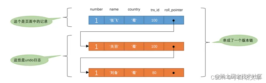 目前页面的记录——生成该版本的事务id为100,所以对快启快照的事务来说不可读,根据回滚指针跳到下一个版本也不行,再到下一个版本,id为80,小于min_trx_id,对快照事务可见,说明生成刘备这条记录在创建快照的事务之前就已经提交了,事实也是如此。这也就是读已提交的验证,事务100此时还没提交对于快启快照的事务是不可见的。下面进一步验证: