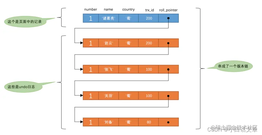 页面的目前记录——生成该版本的事务id为200,不符合一直跳到张飞对应的版本才可见。分析结束。 所以这两次select都会开启一个新的快照ReadView。如果事务id200的记录也提交,此时select3的话诸葛亮就可见了。