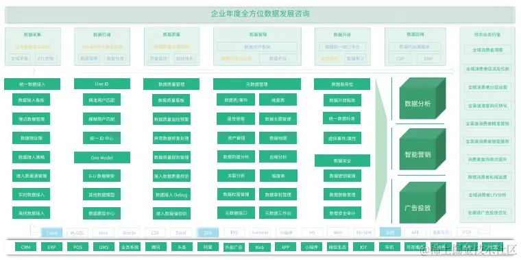 数据打通的核心是实现数据模型和标准的统一,企业数据的存储按照标准的四层数据分层进行,每层数据的存储进行差异化的类型定义和受众对象。在分层的基础上考虑数据模型本身的设计,遵循数据服务于业务,业务形态决定数据模型。