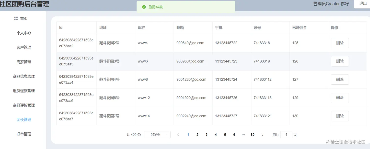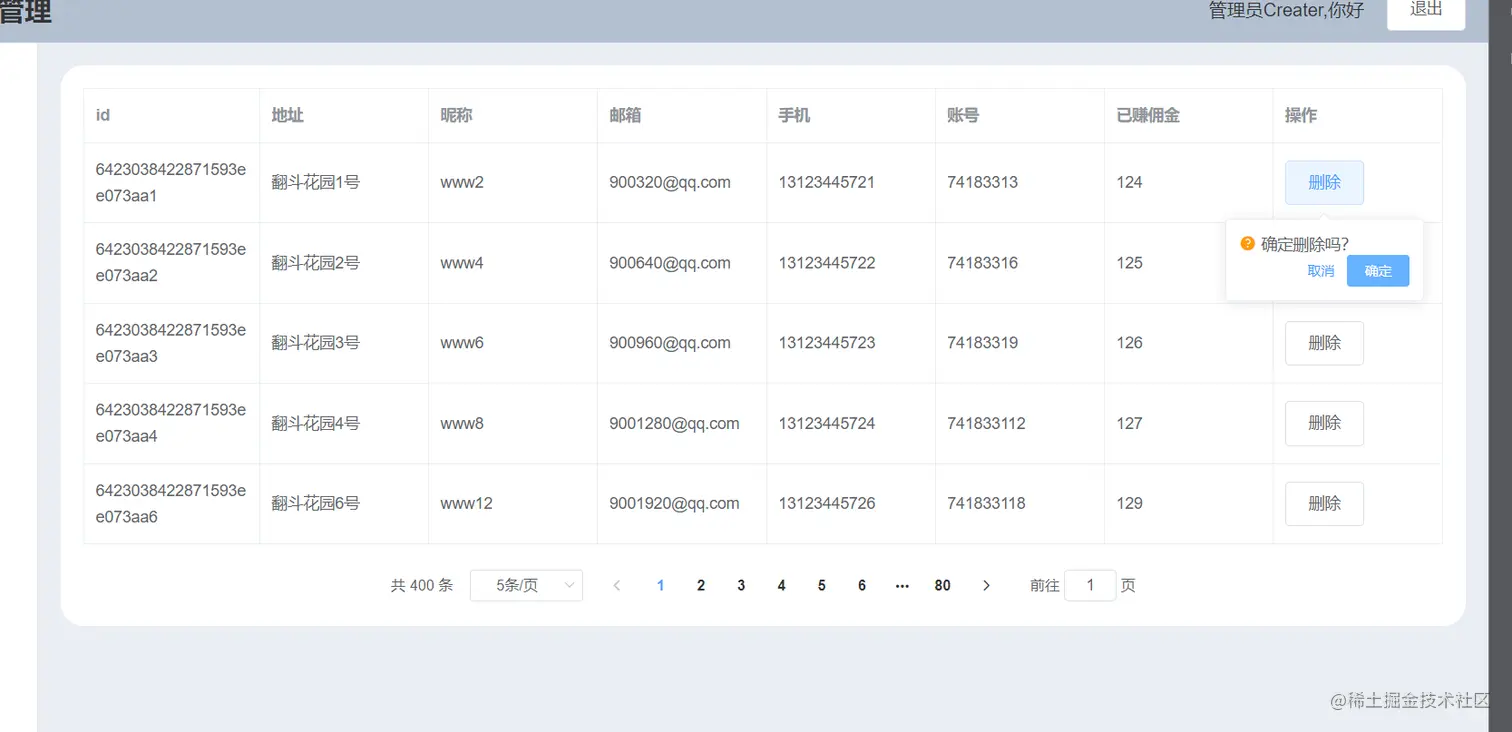 //团长app.post("/admin/getchief",async(req,res)=>{ const {type,page,size} = req.body; try{ const result = await chiefInfo1.find({ type }).skip((page - 1)*size).limit(size);//分页 const total = await chiefInfo1.find({ type }).countDocuments(); res.send({ result, total }) } catch(error){ res.send('error'); }})//删除团长数据app.post("/admin/deletechief",async(req,res)=>{ const{ _id } = req.body; try { await chiefInfo1.findByIdAndRemove(_id); res.send("success"); }catch(error){ res.send("error"); }})