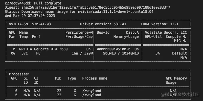 这样,已经成功安装好并启动了 wsl2 中的支持 GPU 调用的 docker 了,可以使用下面的命令测试: