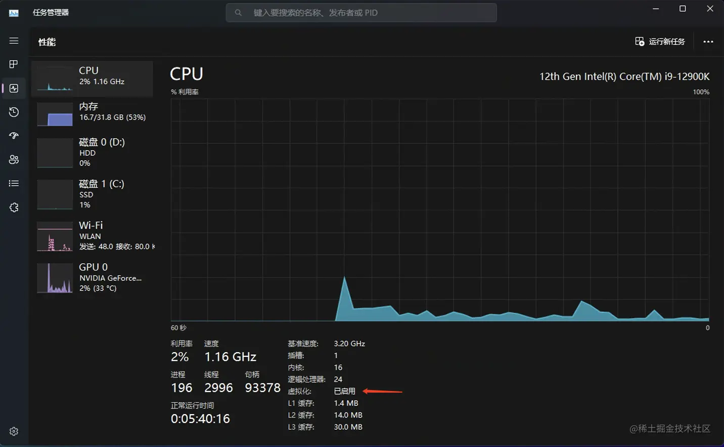 首先确保虚拟化选项开启,若未开启,则进 BIOS 开启。现在的机器一般都是默认开启的,可以进 任务管理器 -> 性能查看。