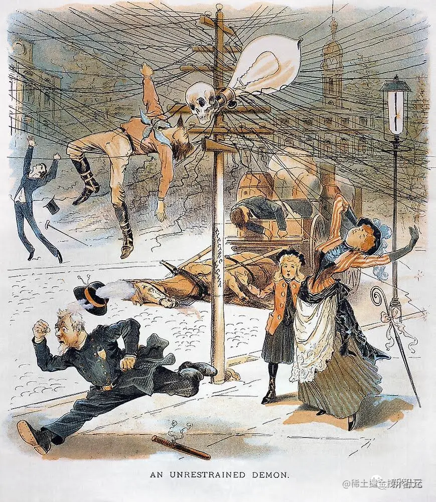 反对的人甚至贴出了爱迪生指使人画的交流电害死人的宣传海报,认为这不过莫名的指控,是别有用心的势力在误导不明真相的群众。