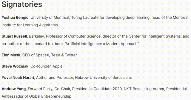 目前签名的有,图灵奖得主 Yoshua Bengio、Stability AI 首席执行官 Emad Mostaque、苹果联合创始人 Steve Wozniak、纽约大学教授马库斯、马斯克,以及「人类简史」作者 Yuval Noah Harari 等等。