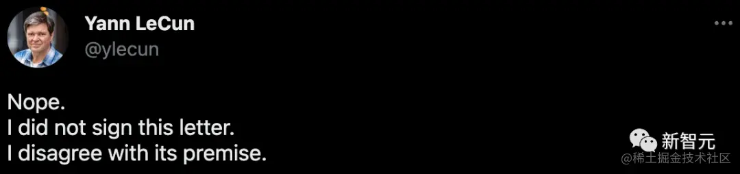 不过,同样作为图灵奖得主的 Yann LeCun 并没有签署:「我不同意这个前提。」
