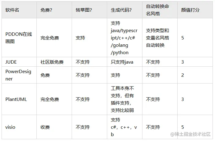 作为PDDON的作者(几个资深全栈架构师),在使用过诸多免费版UML建模工具后,旨在提供一款免费易用美观的UML建模工具,下面以常见的一些uml建模工具和PDDON在线画图做对比: