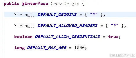 2)使用@CrossOrigin,spring能流行的一部分原因我相信有标签的功劳,使用spring标签能帮助我们更优雅简洁的编写代码,所以当我了解到有可以解决跨域问题的@CrossOrigin标签时也是毫不犹豫的用了,按照百度上大多数人的说法在方法上面加上@CrossOrigin标签就可以直接解决问题了,再不济就加上@CrossOrigin(origins=”xx”)指明允许跨域的源就可以了,但很遗憾,无论是哪种方法对我都没有作用,于是深入研究@CrossOrigin,查看其源码发现,除了allow-methods外其他四个参数都是有默认值的(注:此处是基于org.springframework 4.23版本)