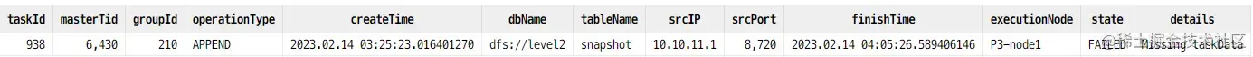 若无法分析失败原因,请联系技术支持人员进行处理。可以暂时跳过失败的任务,继续执行之后的任务,在从集群的数据节点上执行以下语句跳过该任务。