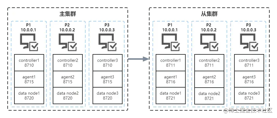 clusterReplicationMasterCtl 指定主集群控制节点。若主集群为高可用集群,则指定为控制节点 raft 组中的任意节点即可。在本例中指定 P1 服务器中的控制节点。