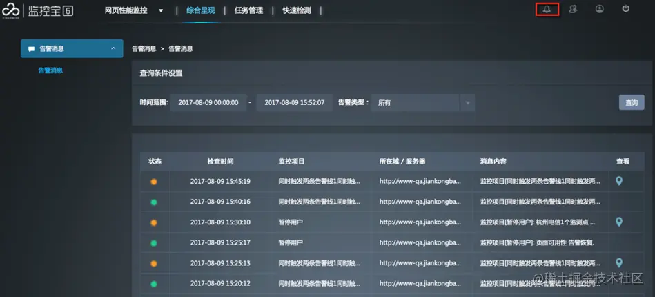 当监控任务有告警消息时,您还能够在右上方看到实时消息提醒,单击【消息图标】查看告警消息,如下图所示。