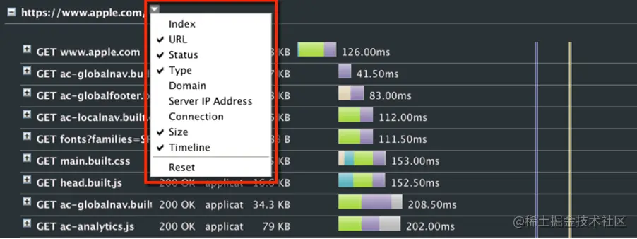 将鼠标移至请求URL上并单击右上角的小三角可设置需要在元素瀑布图中显示的内容。