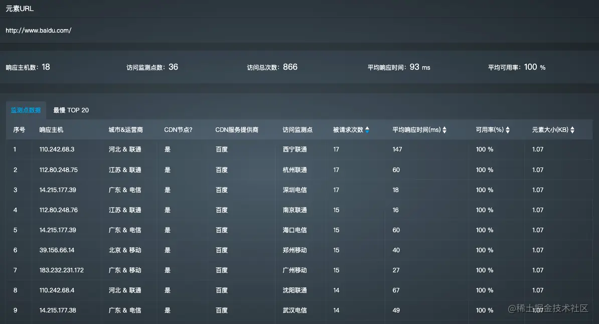 单击元素URL>监测点数据,对单个元素进行详细分析,包括响应主机数、城市&运营商、访问监测点数、访问总次数、平均响应时间、平均可用率和元素大小。同时还能查看具体每一个响应主机是否为CDN节点、CDN服务提供商、访问监测点、被请求次数、平均响应时间和可用率。
