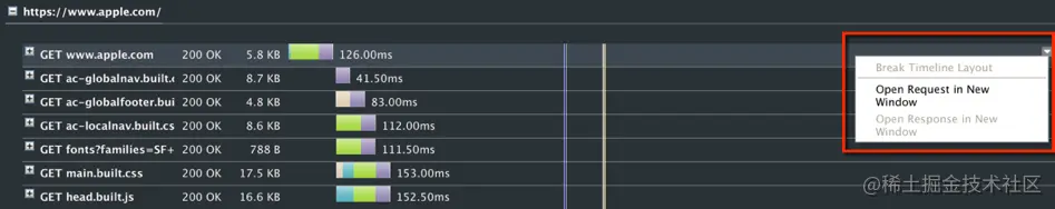 将鼠标移至请求元素上并单击右上角的小三角可分割元素瀑布图、在新窗口查看请求或返回内容。