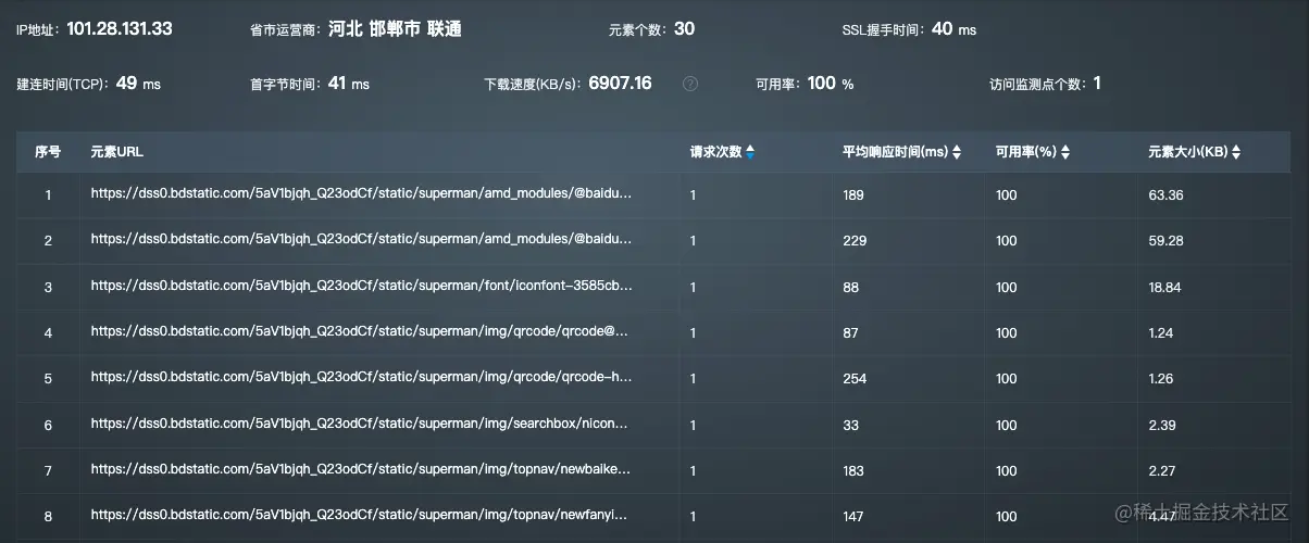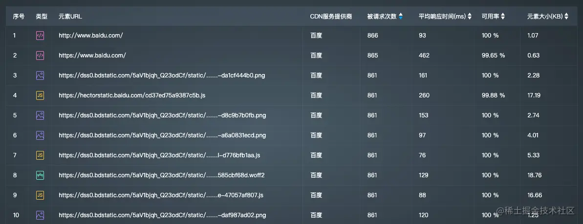 在元素列表中,查看每个元素的CDN服务提供商、被请求次数、平均响应时间、可用率和元素大小。