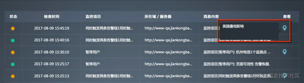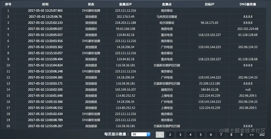在列表中查看每次监控的时间、状态类型、监测点IP、监测点、目标IP、DNS服务器。