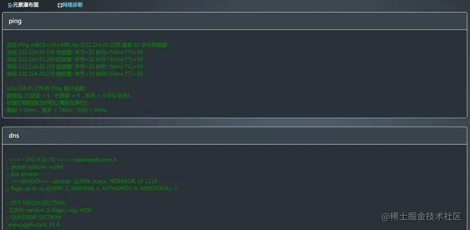 在网络诊断中查看Ping、DNS、TraceRoute的具体诊断信息,如Ping丢包率、DNS解析记录、TraceRoute跳数及跳转路径,分析请求元素不可用原因。