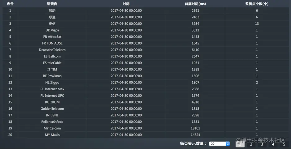 在列表中查看各运营商的详细数据,包括每次监控的时间、首屏时间和监测点个数,如下图所示。
