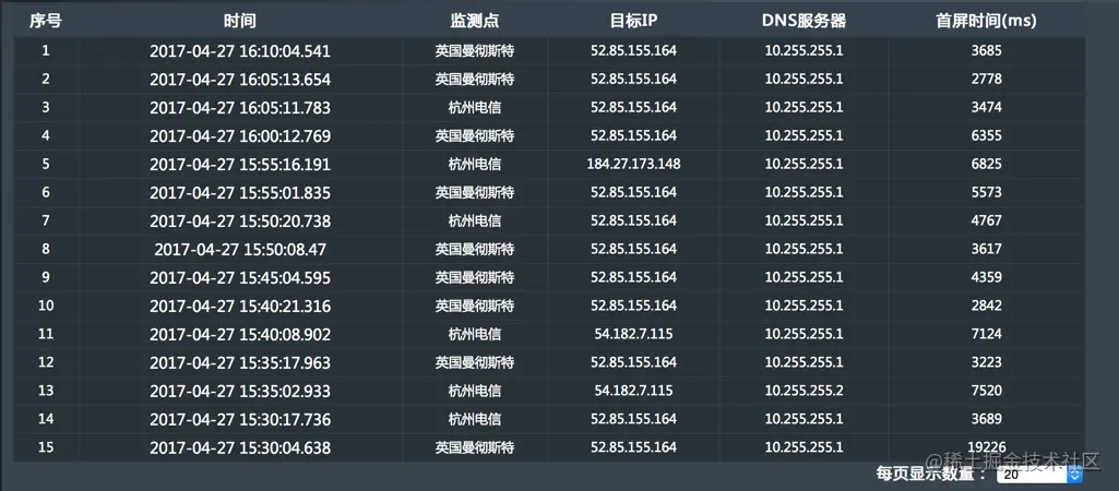 在列表中查看每次监控的时间、监测点、目标IP、DNS服务器和具体的响应时间。