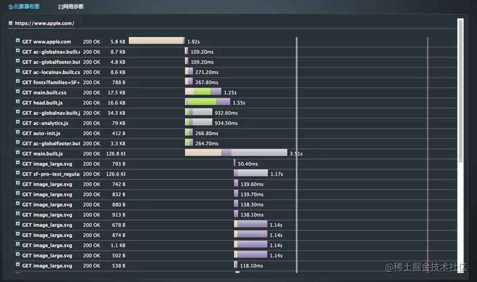 在元素瀑布图中查看每个请求元素的详细分析,包括元素的可用性状态、大小、响应时间瀑布图等。响应时间瀑布图中包括阻塞等待时间、DNS解析时间、建立连接时间、发送请求时间、等待时间、接收数据时间以及DOM加载时间、页面加载时间、首屏时间基准线。