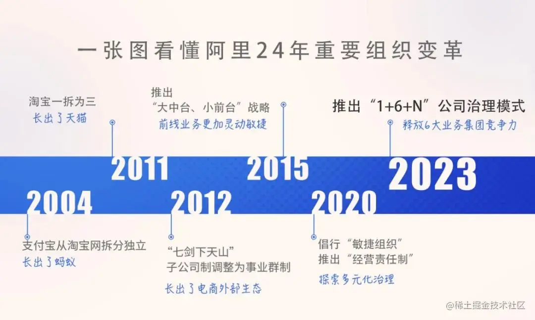 往深了想,大船要调头、乘风破浪离不开“组织”。面临组织僵化,阿里不仅要变,而且是“巨变”。据一位阿里人士透露,张勇花了几年时间做准备,这一次调整计划始于 2023 年初,“阿里24年的发展,历史上前所未有,变化最大。”
