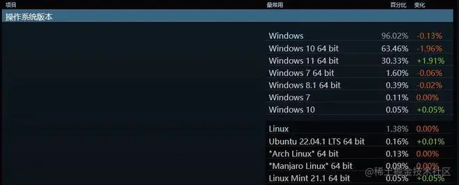 针对Linux在Steam平台的市场份额调查显示,到2022年11月,该平台上的Linux玩家占比1.44%,但同样的Windows玩家高达96.11%。