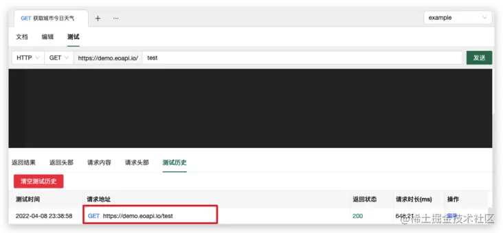 在测试时我们只需要选中相应的请求地址,测试时域名就会自动加到 API 路径前面,可以通过切换环境快速对开发、测试、线上环境的 API 进行测试