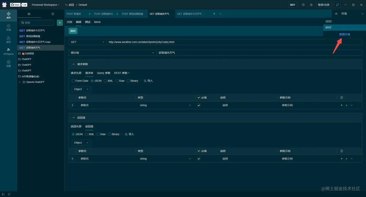 在 API 文档或测试中使用的方式引用环境变量,在发送请求时会自动将环境变量替换为响应的值。