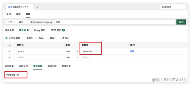 改变请求参数的 Key 和 Value, 比如表单中有一个参数的 version,值是环境变量: