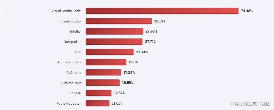 74.48%的开发人员选择Visual Studio Code作为首选IDE。
