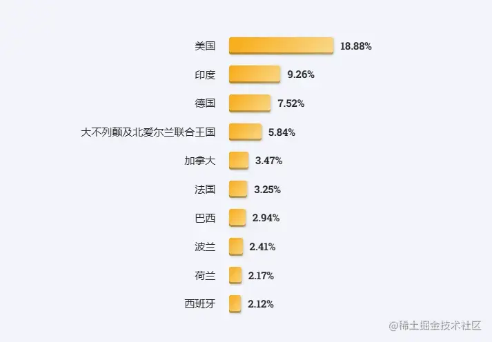 根据StackOverflow的2022年的统计,程序员数量最多的10个国家分别是:美国、印度、德国、英国、加拿大、法国、巴西、波兰、荷兰、西班牙,美国大约有400万开发人员。