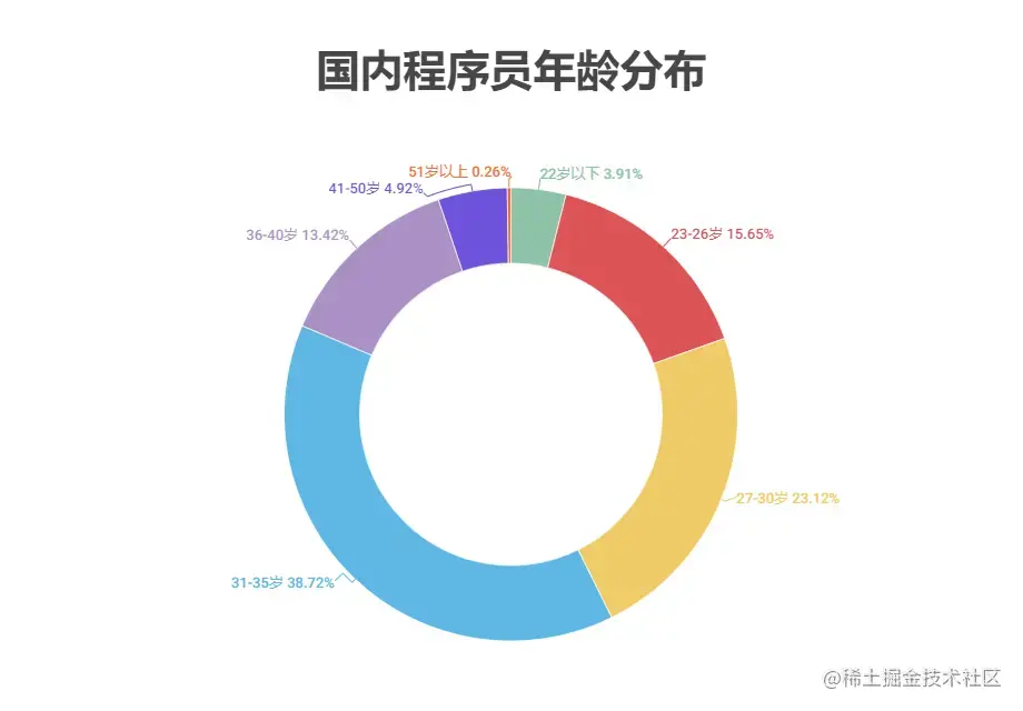 Stack Overflow的数据显示,大多数开发人员(即48.42%)来自25-34岁年龄组。35至44岁的开发人员占21.71%。国内部分,31-35的程序员数量最多,占比38.72,23-35岁的程序员占比高达77.49%,35岁瓶颈非常明显。