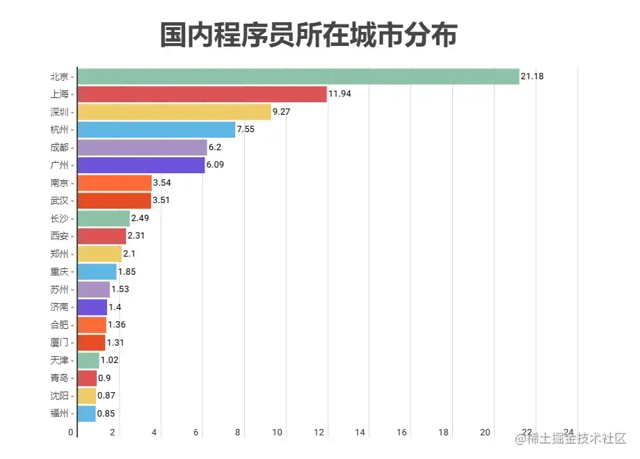 华盛顿州是美国软件开发人员比例最高的州 (3.6%),国内方面,北京的程序员数量远超其他城市,成都进入前五,越来越受到程序员的青睐。
